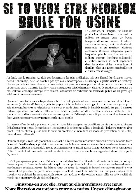Contrairement à ceux qui ont tout à y perdre, leur fric, leur pouvoir et leurs rôles sociaux, nous entendons fissurer la paix sociale à toute occasion. Nous voulons poser le problème de l’exploitation et de la domination partout où elles existent, de jour comme de nuit. Nous ne voulons plus voir les riches exhiber leur tranquillité au coin des rues, des ateliers de travail et des ateliers d’artistes, dans les bars branchés... Car elle est inséparable de la misère qui l’accompagne et qu’ils essayent de repousser en zone 5 du RER ou sous un pont du périph’.